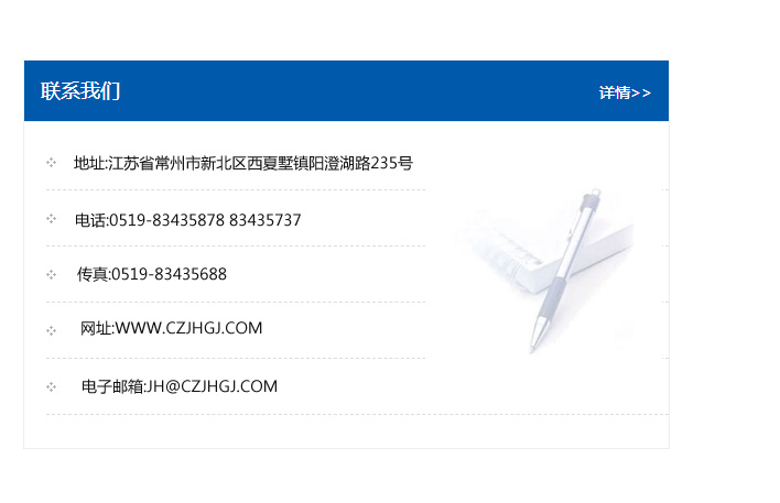 地址:常州市新北區友邦商務大廈1幢16、17層  電話:0519-85101652  傳真:0519-85112595  郵編:213022  網址:www.cz-jiayue_cn.hongdaqp.com  郵箱:xiajifengaa@163.com
